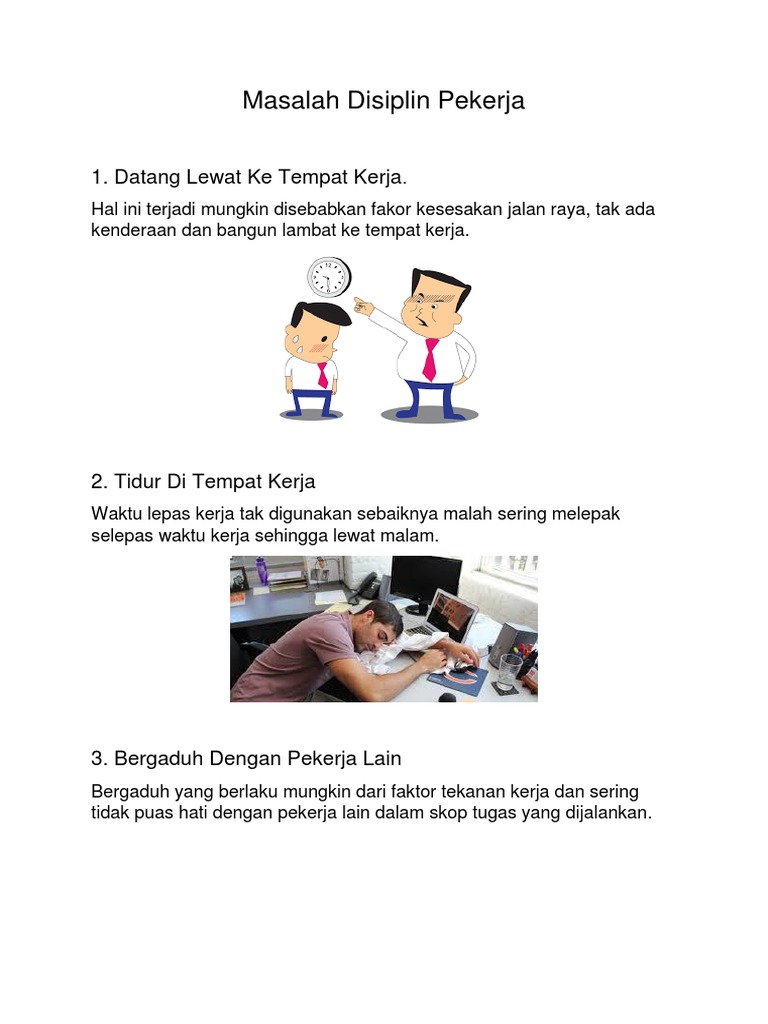 Frekuensi kehadiran salah satu tolak ukur untuk mengetahui. Disiplin melaksanakan k3 dalam bekerja. Disiplin kerja di kantor bukan hanya masalah dominasi peraturan dan hukuman yang diterapkan oleh perusahaan. Isu disiplin pekerja yang pertama ialah tidak hadir bekerja tanpa sebab yang munasabah dan gagal untuk memaklumkan kepada pihak jabatan bahasa mudahnya ialah ponteng kerja. Faktor fisik adalah faktor yang berkaitan dengan keadaan fisik pada lingkungan tempat bekerja serta keadaan fisik karyawan. Jika anda mempunyai pekerja yang kaki ponteng, ia adalah isu disiplin yang perlu ditangani dengan segera. Pengertian disiplin kerja merupakan kepatuhan karyawan terhadap seluruh aturan yang ada di perusahaan tempat ia bekerja. Yang berkualiti untuk bekerja di sektor lain yang menawarkan ganjaran yang lebih. Masalah yang dihadapi oleh sektor awam adalah kecenderungan pekerja atau sumber manusia. Terdapat berbagai macam jenis disiplin, diantaranya disiplin belajar dan disiplin bekerja. Tapi, apa yang dimaksud dengan disiplin kerja? Mengikut penulisan hussein mahmood dan kamaruddin abd rahman (1981), faktor besar yang menyebabkan masalah disiplin ialah faktor kewangan, faktor persekitaran dan faktor sekolah. Kajian ini bertujuan untuk mengenal pasti faktor penyebab masalah disiplin murid di sekolah.