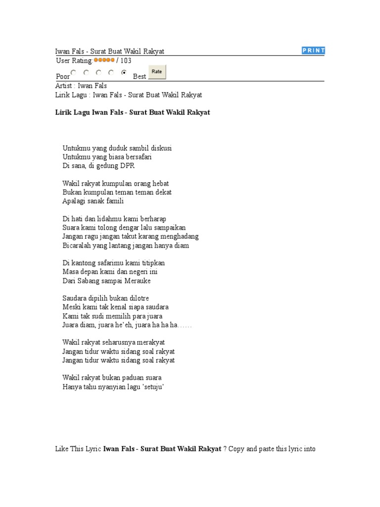 This is sumpah wakil rakyat by ucup affandi on vimeo, the home for high quality videos and the people who love them. English translation of lyrics for surat buat wakil rakyat by iwan fals. Untukmu yang duduk sambil diskusi untukmu yang biasa bersafari di sana, di gedung dpr wak. Deutsch english español français hungarian italiano nederlands polski português (brasil) română svenska türkçe ελληνικά български русский српски العربية 日本語 한국어. Lagu ini sering dimainkan oleh papa saya saat kami sekeluarga di mobil pergi pulang kampung, saat itu saya masih 4 tahun.