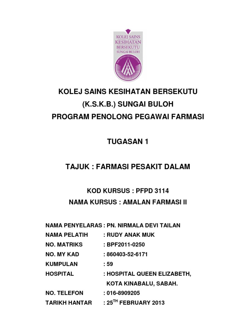 Verarosa at kolej sains kesihatan bersekutu (kskb) sg buloh. Contact kolej sains kesihatan bersekutu sungai buloh on messenger. Kolej sains kesihatan bersekutu sungai buloh. Kolej latihan dan kolej teknologi. ) sungai buloh program penolong pegawai farmasi. Selamat datang semua.semoga anda bergembira di sini. Uiam telah menubuhkan satu kampus di kuantan yang menepatkan. 13.87km from kolej sains kesihatan bersekutu ulu kinta. Kolej sains kesihatan bersekutu sungai buloh, jalan hospital, sg. The 42 acres college is the grouping of three ministry of health's institutes namely kolej pembantu perubatan ulu kinta, kolej kejururawatan ipoh and kolej. Kolej sains kesihatan bersekutu kota kinabalu ba. Download lagu dan video terbaru. Kolej sains kesihatan bersekutu sungai buloh, selangor.